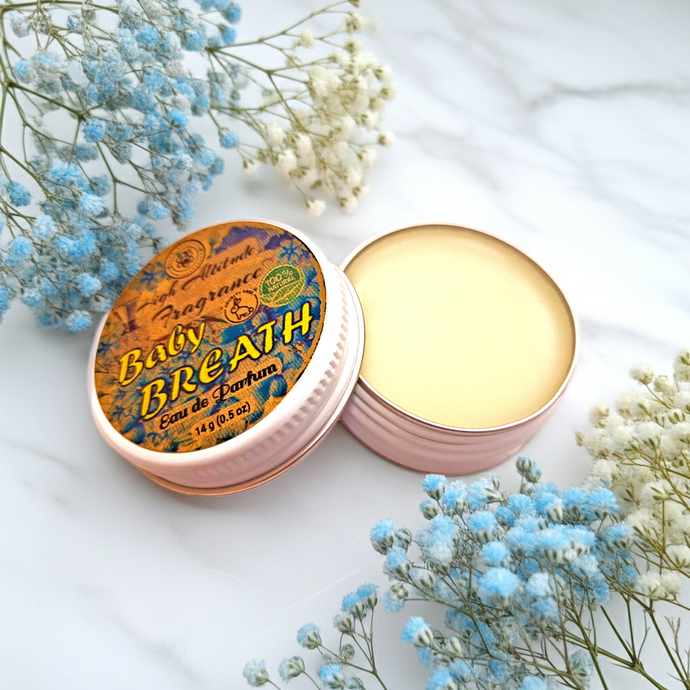 Experience the gentle beauty of Baby Breath Solid Perfume—a fresh, light, and airy aroma that is subtly powdery, brightened with luminous citrus, and wrapped in a quiet veil of floral elegance and gentle mystery. It opens with a clean, delicate brightness reminiscent of the first breath of spring. As it warms on the skin, the fragrance reveals a soft bouquet of luminous petals, creamy white florals, and a whisper of warm sweetness, creating a tender, serene aura.